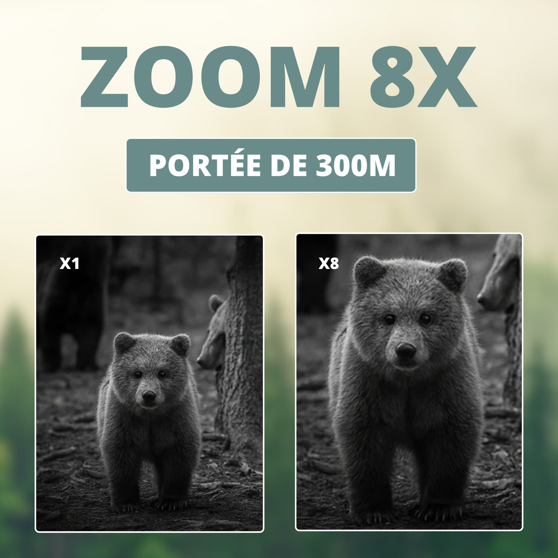 L’éclairage infrarouge 850nm réglable sur 7 niveaux permet une vision nette et contrastée même dans l’obscurité totale. Son zoom 8x vous aide à repérer les détails invisibles à l’œil nu.
